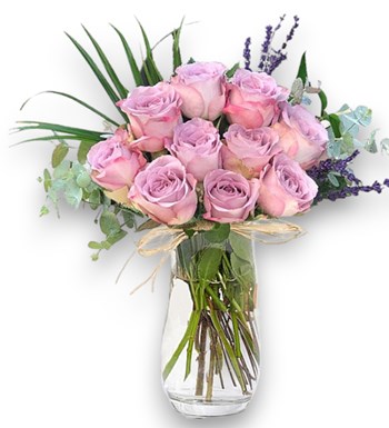 Cam vazo içerisinde 9 adet ithal lila gül ile hazırlanmış aranjman.