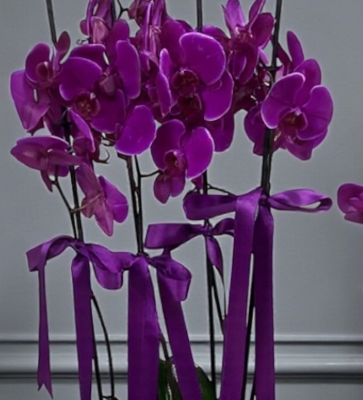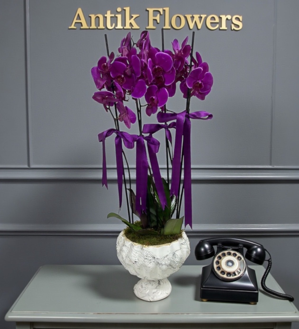 Beyaz Antika Saksıda 6 Dallı Mor Orkide