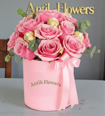 Pembe kutu içerisinde 15 adet pembe gül ve çikolata .