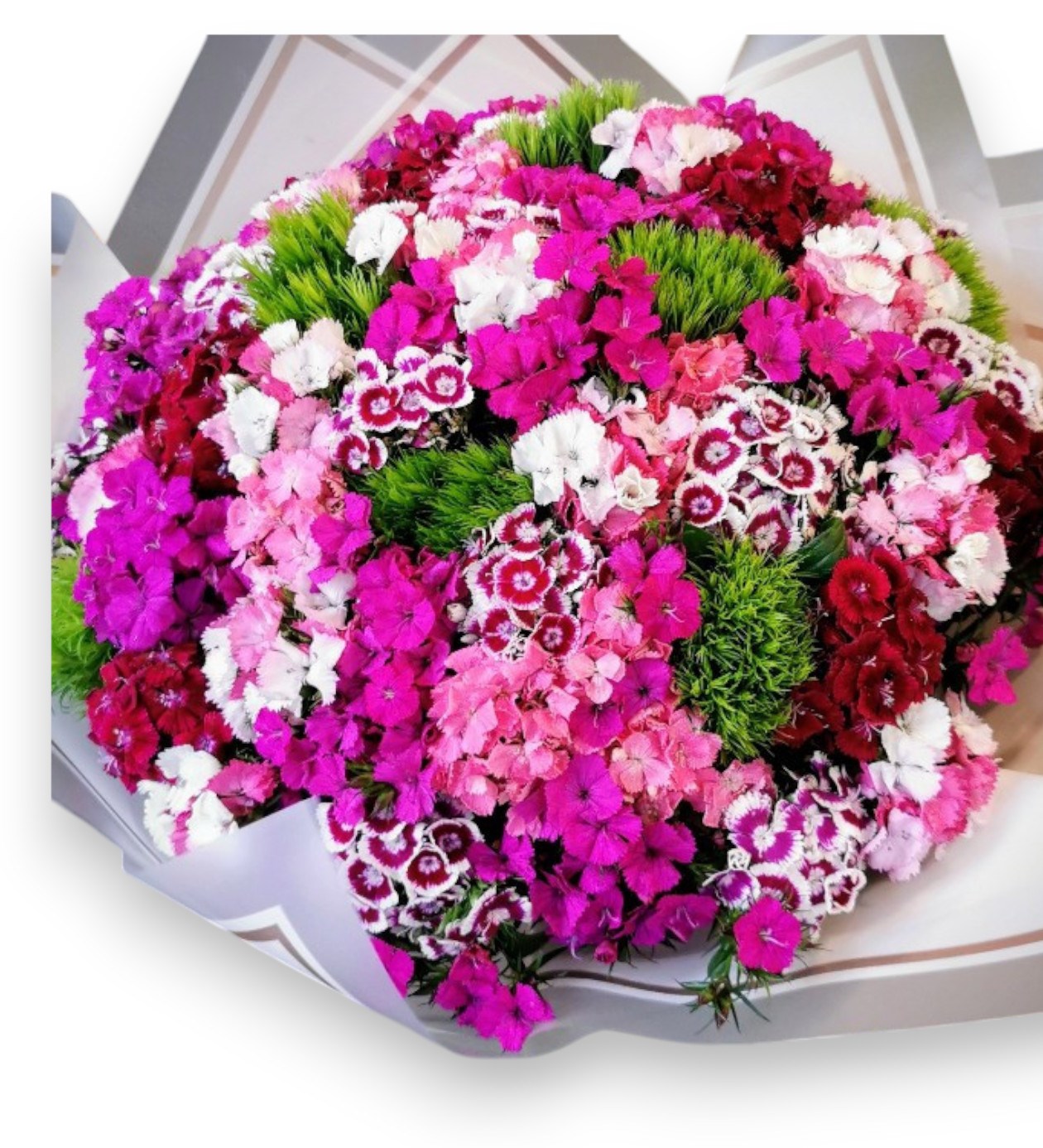 Beyaz ambalaj kağıdında hazırlanmış renkli mevsim buketi.